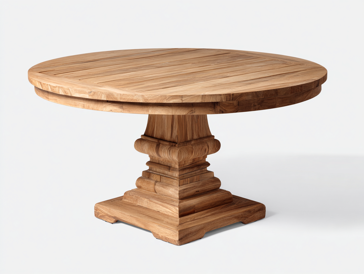 Der Tisch besteht aus Holz in natürlicher Farbgebung und zeichnet sich durch eine stabile Konstruktion aus. Die Tischplatte besitzt eine gleichmäßige Lamellenstruktur, die eine praktische Oberfläche für den Außenbereich bietet. Der zentrale Sockel aus massivem Holz sorgt für eine sichere Standfestigkeit und unterstreicht die klassische Gestaltung.