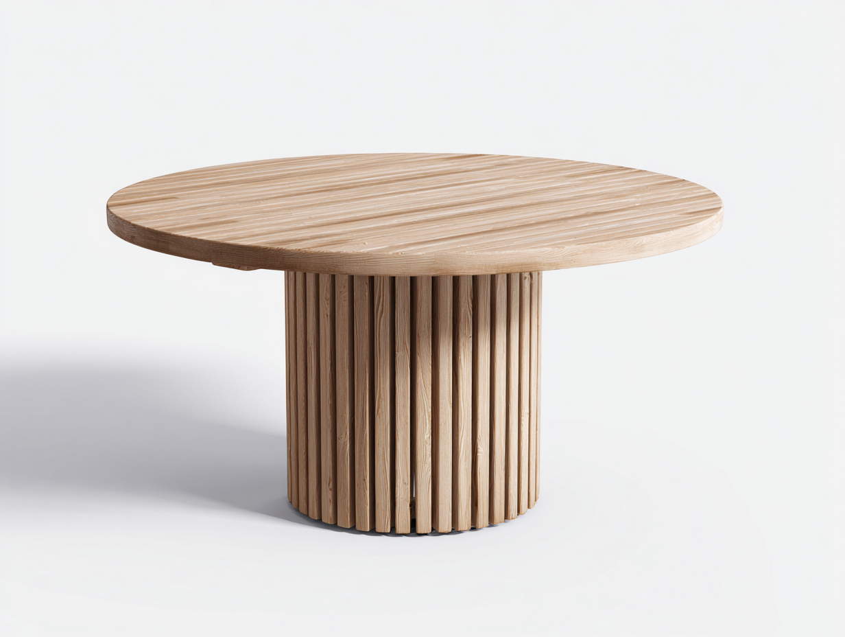 Der Tisch ist aus Holz gefertigt und in natürlicher Farbgebung gehalten. Die Tischplatte zeigt eine gleichmäßige Lamellenstruktur, die dem Möbelstück eine natürliche und zugleich moderne Optik verleiht. Das Untergestell besteht aus vertikal angeordneten Holzelementen und sorgt für eine stabile Konstruktion sowie eine markante Gestaltung.